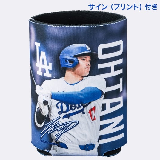 本品は、アメリカで制作されたMLB公式のグッズで、350mL缶やペットボトルがすっぽり収まるサイズのクーラーです。表側は大谷選手と本人直筆のサインがプリントされていて、裏側には背番号が入った限定デザイン。保冷機能で飲み物の冷たさをキープし、結露も防止でき、デスク上はもちろん、アウトドアやイベントなどお出かけにもピッタリのアイテムです。