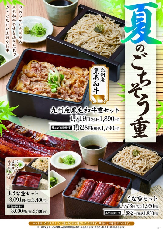 株式会社家族亭(本社・大阪府大阪市、代表取締役社長・坪山 憲司)が運営するそば和食チェーン「家族亭」は、2024年8月1日(木)~9月1日(日)の期間に夏のごちそう重フェアを実施します。今年のごちそうは、九州産の黒毛和牛をすき焼きたれでさっと炊いた上品な味わいの「九州産黒毛和牛重セット」や、人気の「上うな重セット」がおすすめです。この夏は、家族亭の自慢のそばと九州産黒毛和牛、うなぎをセットにした夏のごちそうをお楽しみください。