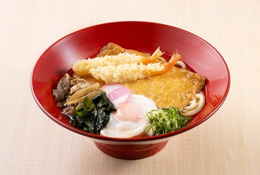 得得うどん 1,320円(税込)海老天に、大判きつね揚げや牛肉にたまごなどいろいろな具材がトッピング!大満足の一杯です。