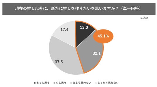 現在の推し以外に、新たに推しを作りたいと思うかを聞いたところ、「とても思う」「少し思う」を合わせると45.1%の人が回答し、約半数の人が新たな推しを作りたいと思っていることが判明しました。