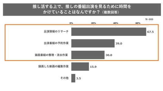 《推しが出演する番組を見るために時間を使っていることの1位は「出演情報のリサーチ」がダントツ。次いで「出演番組の予約作業」や「録画番組の整理・消去作業」》