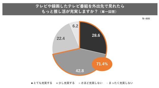 テレビや録画したテレビ番組を外出先で見られたらもっと推し活が充実するかを聞いたところ、「とても充実する」「少し充実する」を合わせると71.4%にも及びました。自宅以外でもテレビを見ることができる環境が、推し活をより充実させる鍵となりそうです。