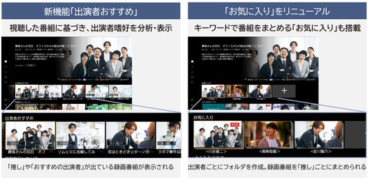 キーワードで番組をまとめる「お気に入り」機能も搭載し、「推し」だけのフォルダが自動でまとめられより見やすく・探しやすくなりました。さらに、ユーザーの視聴した番組に基づき、出演者嗜好を分析・表示する新機能「出演者おすすめ」を使えば、新しい推しとの出会いも見つけることができます。