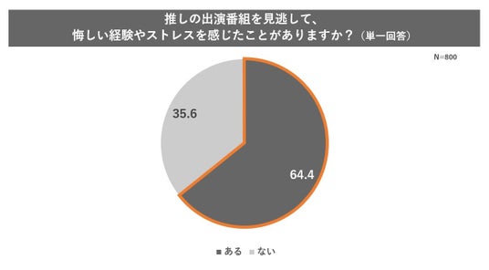 推しの出演番組を見逃して、悔しい経験やストレスを感じたことがあるかを聞いたところ、64.4%の人が「ある」と回答しました。推し活をする上で、出演番組の見逃しは多くの人がストレスを感じている