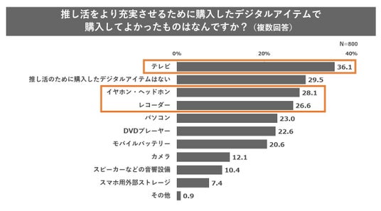 続いて、推し活をより充実させるために購入したデジタルアイテムで買ってよかったものを聞いたところ、1位は「テレビ」で36.1%、次いで「イヤホン・ヘッドホン」が28.1%、「レコーダー」が26.6%と続きました。