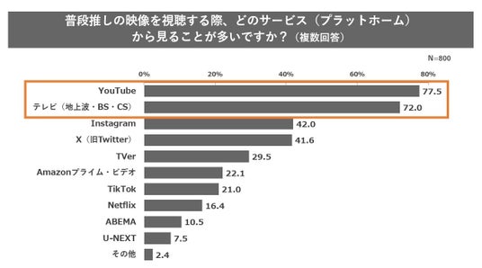 《推しの映像を視聴するプラットホームで多いのは「YouTube」と「テレビ(地上波・BS・CS)」で共に7割以上》
