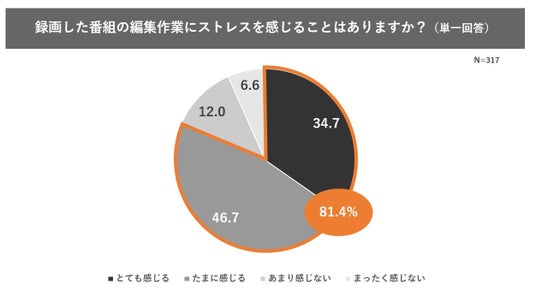 自宅にレコーダーを所持している人に、推しの出演番組を録画した際、推しの出演シーンのみ切り抜く編集作業をしたことがあるかを聞いたところ、「ある」と回答した人が50.6%となり2人に1人が録画番組の編集作業を行っていることが判明しました。しかし、録画した番組の編集作業にストレスを感じることがあるかを聞いたところ、「とても感じる」「たまに感じる」を合わせると81.4%となり、編集作業をする人のほとんどがストレスを感じていることが明らかとなりました。
