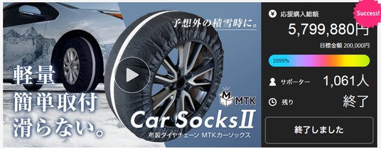カー用品、アウトドア用品の企画・販売を行う、三金商事株式会社(本社:大分県大分市 代表取締役社長:田中 新一)は、クラウドファンディングサイトMakuakeにて目標金額に対して2899%を達成した布製タイヤチェーン『MTKカーソックス2』の一般販売を開始いたします。