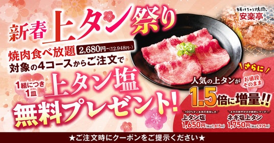 【新春企画 安楽亭の上タン祭り開催!】食べ放題(対象は4コース)のご注文で1組1皿上タン塩を無料プレゼント! さらに、単品の上タン塩とネギ塩上タンが、いつものお値段で1.5倍に増量!!