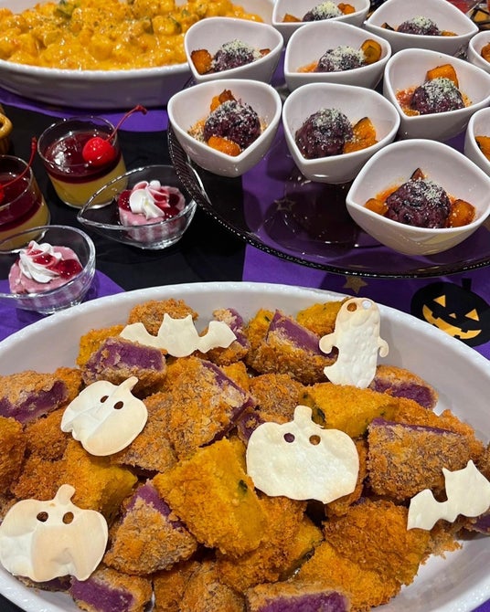 ハロウィンメニュー例:パンプキンスープ/かぼちゃとさつまいものサラダ/イカスミリゾットのライスコロッケ/かぼちゃのから揚げ ほか