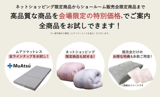 大阪初となる昭和西川のショールーム販売会が、12月7日(土)・8日(日)の2日間限定で開催されます。オンラインショップで人気のアイテムや、昭和西川のロングセラー「ムアツマットレス」など、全商品を実際に見て触れてお試しいただけます。特別価格でご提供する商品も多数ございますので、この貴重な機会をぜひお見逃しなく!