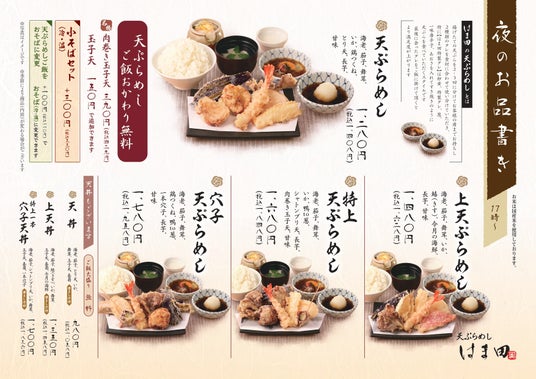 昼は天丼でサッと、夜はゆったり定食を味わう「天ぷらめしはま田」は、地域で愛される店舗を目指してまいります。