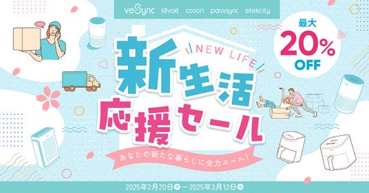 アメリカ発の小型家電メーカーVeSync(ウィーシンク)の日本支社、Vesync Japan株式会社(本社:東京都千代田区、以下VeSync)は、2025年2月20日(木)から2025年3月12日(水)まで、新生活に役立つ人気製品を最大20%OFFでご提供する「新生活応援セール」をVeSync公式ストアおよび各正規販売店/量販店で開催いたします。