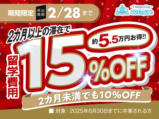 株式会社QQEnglish(本社:東京都渋谷区、代表取締役:藤岡頼光)は、2025年2月28日(金)までのお申込みで、留学費用が最大15%OFFになる「新春留学応援キャンペーン」を開始したことをお知らせいたします。
