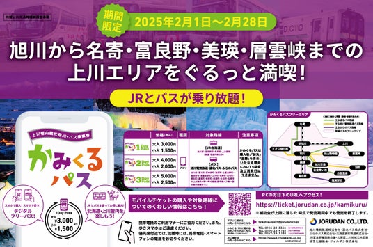 北海道上川地域公共交通活性化協議会(事務局:上川総合振興局地域政策課)では、上川管内における持続可能な公共交通ネットワークの確保に向け、JR富良野線連絡会議(事務局:旭川市交通空港課)と共同して、ジョルダン株式会社が運営するスマートフォン専用アプリ「乗換案内」で現在も販売中の電子チケット「かみくるパス(※)」に旭川駅~富良野駅・名寄駅・上川駅間のJR(普通・快速列車のみ)も乗り放題となる実証事業を2月1日から期間限定で実施します。