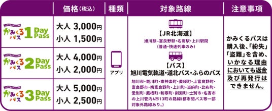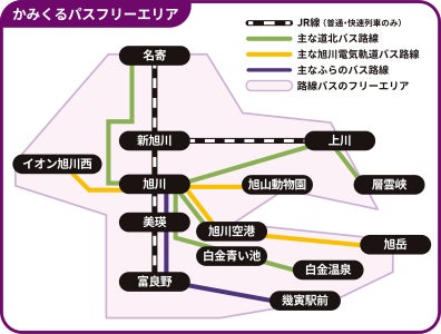 旭川市、東川町、東神楽町、美瑛町、上富良野町、中富良野町、南富良野町、富良野市、上川町、当麻町、比布町、愛別町、鷹栖町、和寒町、剣淵町、士別市、名寄市の上川管内4市13町において、旭川電気軌道、道北バス、ふらのバスが運行する路線バスが乗り放題となる電子チケット