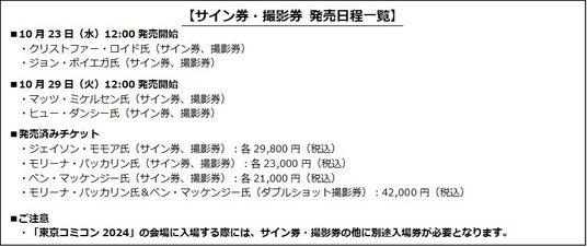 来日が決定した、マッツ・ミケルセン氏とヒュー・ダンシー氏のサイン券・撮影券が発売決定!東京コミコンでは、各来日セレブの“サイン券”をご購入頂くことでサイン会に、そして“撮影券”をご購入頂くことで撮影会にご参加頂けます。サイン券・撮影券は、2024年10月29日(火)12:00より、チケットぴあ及びハリコンサイトの両サイトにて発売開始となります。購入方法や各種チケット料金などの詳細情報に関しては、「東京コミコン2024」公式WEBサイトにてご確認ください。なお、サイン券・撮影券の他に別途入場券が必要となります。また、その他のセレブのサイン券・撮影券に関しては、後日発表予定となりますので今しばらくお待ちくださいませ。