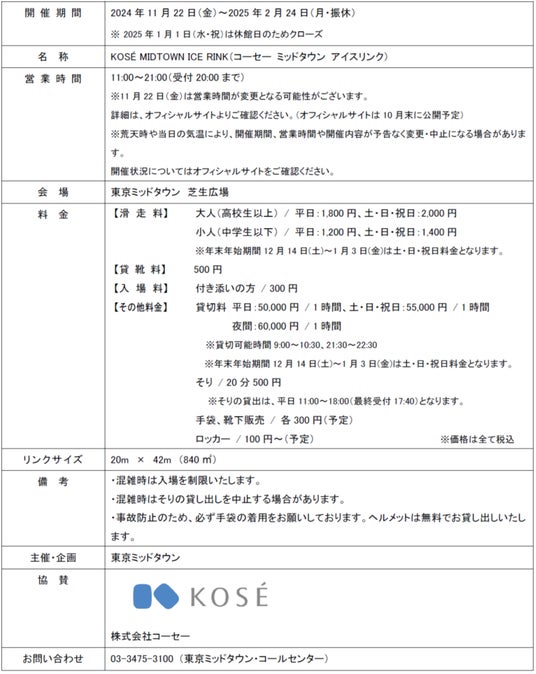 東京ミッドタウンの冬の風物詩、「MIDTOWN ICE RINK(ミッドタウン アイスリンク)」が今年もクリスマスシーズンから登場します。都内の屋外アイススケートリンクでは最大級かつ、本物の氷の上でスケートができる当イベントは今年で16回目。今年は美の創造企業KOSE とコラボレーションし、2月24日(月・振休)までの開催で、ウィンターシーズンを通してお楽しみいただけます。