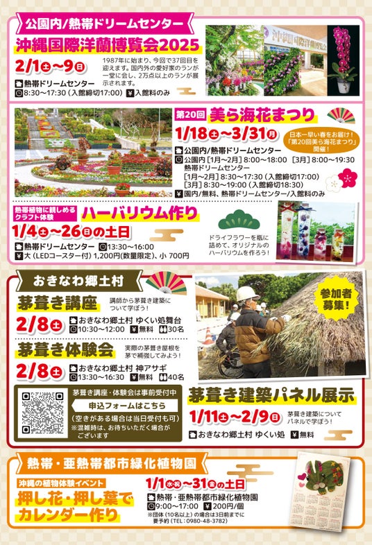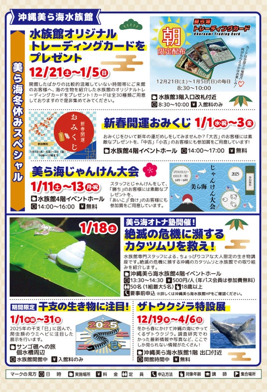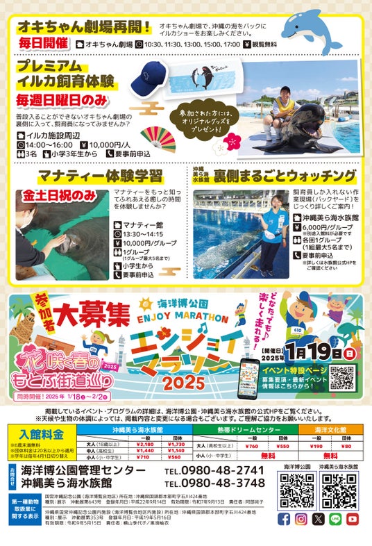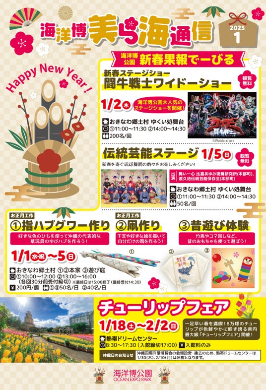 海洋博公園では、施設の魅力やイベント情報をお届けする「美ら海通信1月号」を発行しました!多彩なパフォーマンスが楽しめるステージイベントや色とりどりの花々で彩られる癒しの美ら海花まつり、海洋博公園エンジョイマラソン2025など様々なイベント情報を掲載しております。詳細は海洋博公園公式HPにてご確認ください。