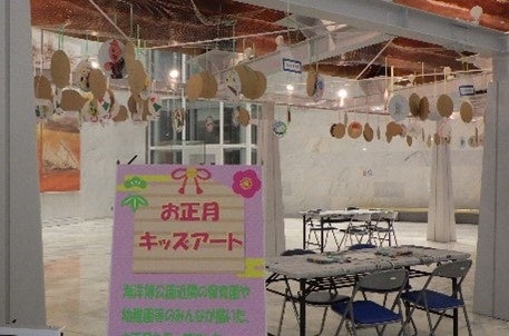 お正月キッズアート&書初め内容:近隣の子どもたちが描いたお正月の絵馬を展示します!当日のお絵描きや筆ペンでの疑似書初めもできます。