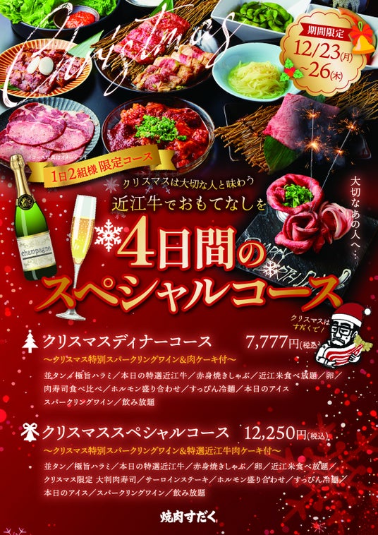 株式会社総合近江牛商社(本社:滋賀県守山市 代表取締役社長:西野 立寛)が運営する【近江焼肉ホルモンすだく】は、滋賀県の一部の店舗で、2024年12月23日(月)~26日(木)の期間、1日2組限定のクリスマスメニュー「4日間のスペシャルコース」を提供いたします。