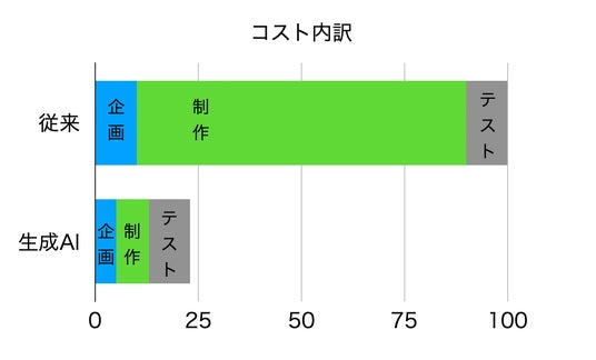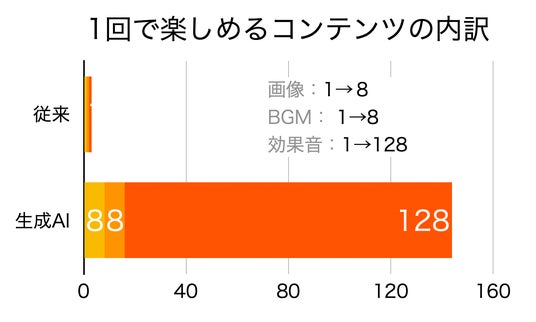 従来の制作費と比較すると、生成AIを活用したことでおよそ90%の制作費が削減されました(当社比)。これまで1つのシーンにつき3個だったコンテンツも、146個に増えました。