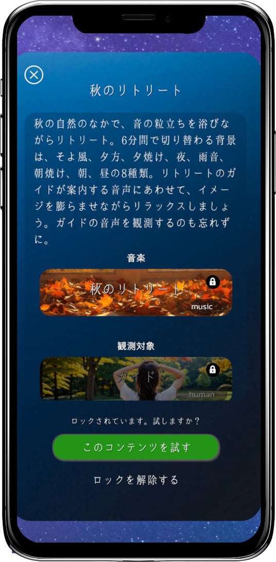 新たに追加されたコンテンツは、8つのシーン(そよ風、夕方、夕焼け、夜、雨音、朝焼け、朝、昼)を順番に巡回します。ガイドの日本語と英語による音声でリトリートが進行し、すべて巡るとおよそ48分間の長旅です。ガイドの音声や内容、ゆったりとした癒しの音楽や背景画像も、そのすべてが生成AIによって制作されました。