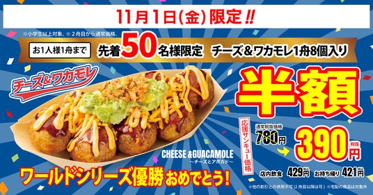 先日のリーグ優勝時には、ドジャースタジアム限定商品「チーズ&ワカモレ」がお得に楽しめるキャンペーンを実施。今回は、ワールドシリーズシリーズ優勝を記念し 先着50名様限定、『チーズ&ワカモレ(8個入)』を通常価格より、半額の390円(税抜) / 421円(税込)でご提供いたします!お得にたこ焼を食べて一緒にお祝いしましょう!!