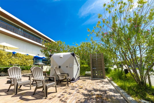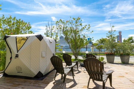 同館のオーシャンズスパ「屋外温水プール」の多目的広場に設置しているテントサウナ。目の前に広がる神戸港の景色を眺めながら外気浴をお楽しみいただけます。また、プールサイドに設置しているため、サウナで温まった後は、水風呂代わりにプールもご利用いただけます。
