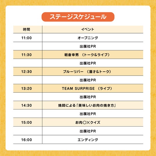 ファミリーで楽しめるお肉の祭典! 会場では、牛肉・豚肉の厳選した部位の試食が無料!大特価で精肉販売も。ステージではスペシャルゲストが会場を盛り上げますので皆様のご来場心よりお待ちしております♪