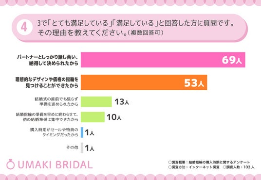 と、「パートナーとしっかり話し合い、納得して決められたから」という回答がもっとも多く、69人がこの理由を挙げました。指輪選びの購入時期において、2人のコミュニケーションの重要性が明らかとなりました。