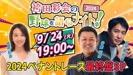 スポーツナビは、2024年9月24日(火)19時より「袴田彩会の野球を語らナイト! 2024ペナントレース最終盤SP」を、公式YouTube「スポーツナビ 野球チャンネル」で生配信します。