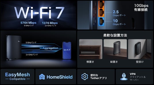 「Archer BE450」は、次世代のネットワーク体験を提供する、7.2GbpsのデュアルバンドWi-Fi 7に対応。*1 超高速かつ安定した接続により、4K/8Kの高解像度ストリーミング、快適なAR/VRゲーム、そして超高速ダウンロードが可能です。高負荷のオンライン体験もストレスなく楽しめます。さらに、MLO(Multi-Link Operation)機能により、複数の周波数帯域やチャンネルを同時に活用し、高スループットと低遅延を実現。*2*5 複数デバイスの同時接続でも、圧倒的な安定性を誇るネットワークを提供します。10Gおよび2.5Gの有線接続に対応し、10GbpsのWAN/LANポートや2.5GbpsのWAN/LANポートを搭載。さらに、1GbpsのLANポート×3が、家庭内の複数デバイスを効率的に高速通信で結びます。*3 ゲーム、ストリーミング、データ転送など、あらゆる用途でパフォーマンスを発揮します。設置方法も自由自在。縦置き、横置き、壁掛けに対応しており、場所を選ばずスッキリとした配置が可能。スペースを有効活用できる柔軟な設計です。また、EasyMesh技術により、他の対応デバイスとシームレスに接続し、メッシュWi-Fi環境を簡単に構築。家全体をカバーする強力なネットワークを実現します。*7 セットアップも手軽。専用のTetherアプリを使えば、簡単にネットワーク管理ができ、誰でもすぐに利用を開始できます。さらに、TP-Link HomeShieldが、家庭のネットワークを多様なサイバー攻撃から保護し、安心してインターネットを楽しむことができます。*6 優れた互換性を誇る「Archer BE450」は、全てのWi-Fi世代と幅広いインターネットサービスプロバイダーに対応しており、どの家庭でも快適にご利用いただけます。*8