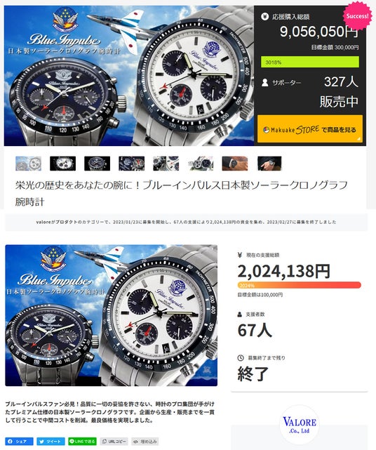 過去に行った弊社のMakuakeとCAMPFIREのプロジェクトでは、合計2300万円を超える金額を集め、大成功を納めた人気のブルーインパルス。合計のサポーター数も延べ1300人に迫る勢いで人気の高さが伺えます。特に弊社では普段使いできるブルーインパルスウォッチを企画した点も多くの指示を集める要因になっています。