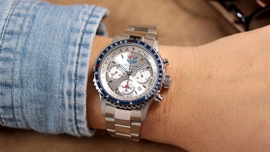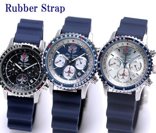 青と白、そして日の丸の赤がカラーリングされた美しいブルーインパルスの機体をイメージしたデザイン。コックピットをイメージしたクロノグラフ、そして大空を自由自在に飛行する姿から、航空用回転計算尺(パイロットクロノグラフ)を採用。ブルーインパルスの魅力が余すところなく凝縮された腕時計となっております。