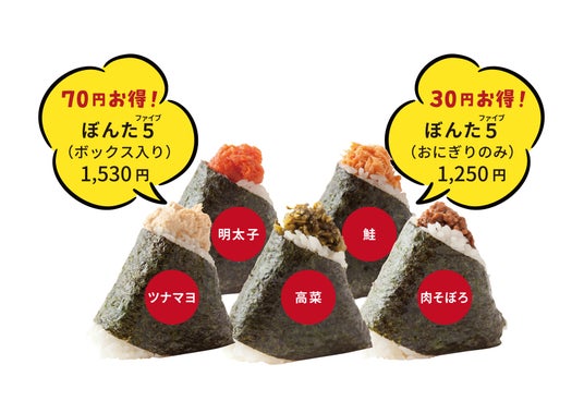 ぽんた5(ファイブ)は、紅鮭のほぐし身・辛子明太子・肉そぼろ・高菜油炒め・ツナマヨネーズの人気5種が入ったお得なセットメニューです。1,250円で単品よりも30円お得に購入可能。旅行の手土産にもしやすい東京駅限定ボックス入りは、1,530円(70円お得)です。