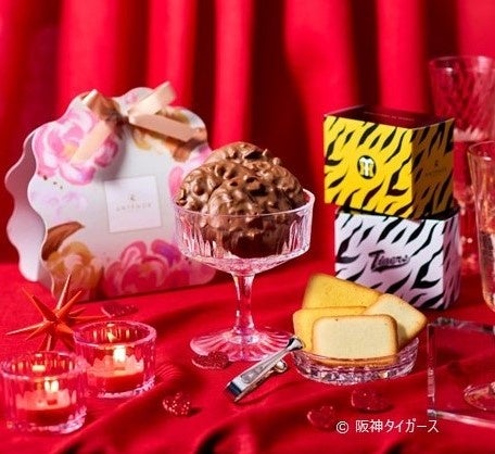 <販売予定数1,000>ベルギー産クーベルチュールのチョコで包んだアーモンドクッキーと、阪神タイガース柄のボックスに入ったチョコサンドのラングドシャ。どちらもそのまま贈れるパッケージで、プチギフトにもおすすめです。