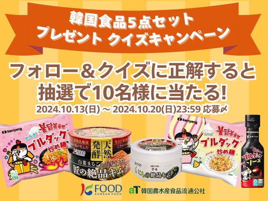 韓国農水産食品流通公社 大阪支社(以下「aT大阪」、大阪市中央区、大阪支社長:権顕周)は関西テレビの番組「ロザンのクイズの神様・超」で韓国産キムチが取り上げられることを記念して、X(旧Twitter)でクイズキャンペーンを実施します。放送後にaTセンター公式X(@aTcenter_japan)からも番組内容にまつわるクイズを投稿。アカウントをフォローしてクイズに回答、正解者の中から抽選で韓国食品セットが当たるプレゼントキャンペーンです。