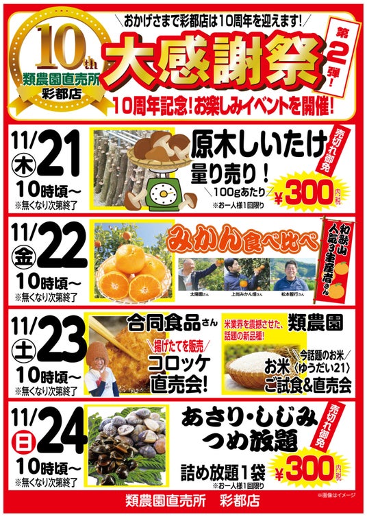 株式会社類設計室(本社:大阪市淀川区、社長:阿部紘)農園事業部が運営する「類農園直売所 彩都店」は、2024年10月に開業10周年を迎えました。お客様に日頃の感謝の気持ちを込めて11月21日(木)から24日(日)まで「開業10周年記念 大感謝祭第2弾」を開催します。21日は原木しいたけの量り売り、22日はみかん食べ比べ、23日はコロッケとお米(ゆうだい21)の直売会を、24日にはあさり・しじみの詰め放題を行います。23日~24日には会員様限定で2000円ごとの購入で1回、お買物クーポン券が必ず当たる棒くじ引きを(ハズレなし)を実施します。