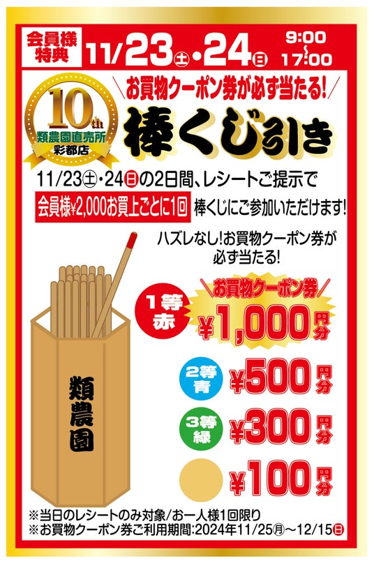 11/23~24にはお買物クーポン券が必ず当たる棒くじ引きを行います(会員様限定)