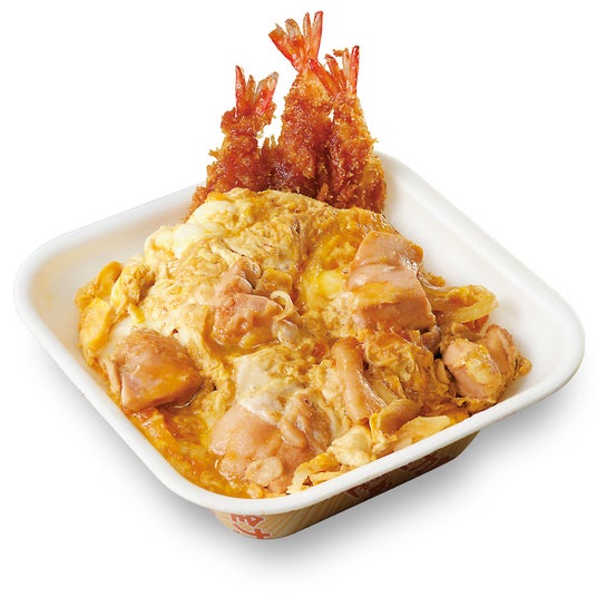 その海老フライを、思わず箸が進む甘じょっぱいタレがしみたタレカツに仕立てました。さらに鶏の旨味とかつおの風味が溶け込んだ特製の割り下で鶏肉を煮込み、鶏卵2個を使用した卵とじを上からのせることで最後のひと口まで丼として堪能できる一杯です。