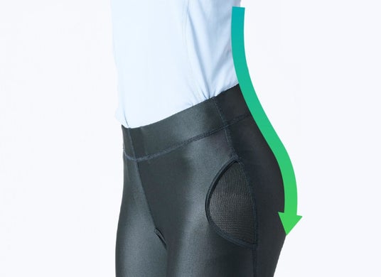 ウエスト部分の幅広ゴムベルトが腰を支え、姿勢崩れにアプローチします。骨盤を前に傾けることで、腰に自然なS字カーブが生まれ、マラソンなど長時間走る際のフォームをサポートします。また、腰側を長めに設計したことで、S字カーブを意識しやすくなっています。