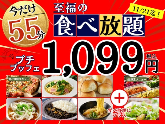 45分間の食べ放題コース『プチブッフェ 999円(税込1,099円)』を、11/21(木)迄の期間限定にて、お値段はそのまま『10分』拡大キャンペーンを開催いたします!