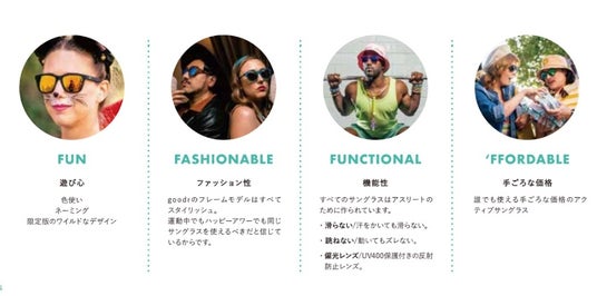 これまでの一般的なランニング用サングラスはオーバースペックかつ高価で、デザイン性が乏しいものが多く、購入のハードルが高い中、「goodr / グダー」は、手頃で スタイリッシュなデザインでパフォーマンスにも優れ たランニング用サングラスを作ることを目指し、2015年 にカリフォルニアで誕生しました。