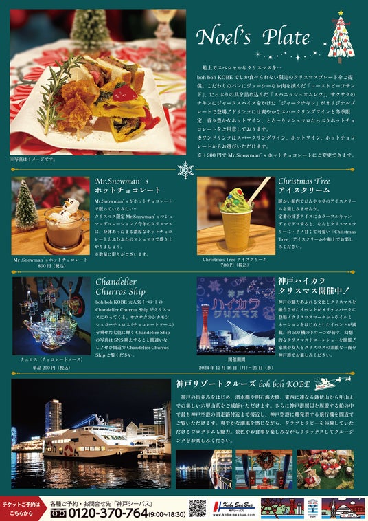 今年も残すところ、あと数日。様々な場所でライトアップされ、街全体がクリスマスのワクワクとした雰囲気に包まれています。boh boh KOBEでクリスマスをお祝いするため、Mr.Snowman's ホットチョコレートやChristmas Treeアイス等、イベント期間限定にしか提供されない様々なスペシャルメニューをお届けします。「クリスマスプレミアムシート」をご購入いただくと、乗船券、Noel's Plate、ワンドリンクが付いてるので、お買得!船上で神戸港の夜景を眺めながら、1年に1度の特別なクリスマスを、大切な人とboh boh KOBEで過ごしてみませんか?