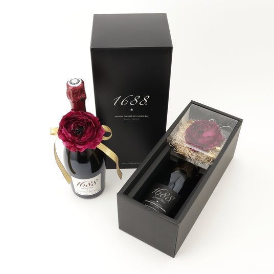 「1688」と造花のセット商品です。ロゼ・ブランどちらともワインレッドのラナンキュラスが付きます。ワインレッドのラナンキュラスの花言葉は「幸福」で、大切な方への想いを込めたギフトにオススメです。造花はアクリルケースに入れてお届けします。