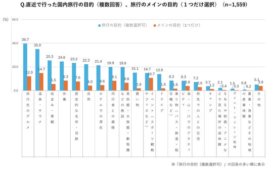 また、そのなかでメインの目的を1つだけ選んでもらったところ、「温泉・サウナ」「旅行先のグルメ」に続いて「イベント(スポーツ観戦やフェスなど)」が3位で10.7%でした。自分のお気に入りのチームやアーティストなどの「推し活」を目的とした国内旅行の需要も感じられる結果となりました。