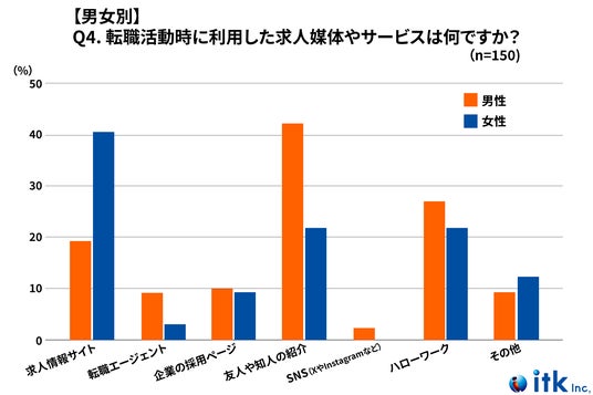 また、男性は「友人や知人の紹介」が42.4%と非常に高い割合を占めていたのに対し、女性は「求人情報サイト」が40.6%と、利用する媒体やサービスにおいて男女の違いがあることも分かりました。