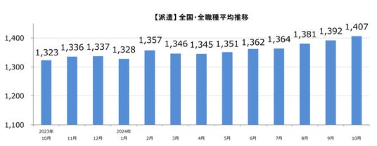 【派遣】全国・全職種平均時給は1,407円。前月比+15円。前年同月比+84円