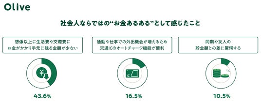 また社会人だからこそ感じた「お金のあるある」を聞いたところ、「想像以上に生活費や交際費にお金がかかり手元に残る金額が少ない(40.5%)」、「通勤や仕事での外出機会が増えるため交通ICのオートチャージ機能が便利(16.5%)」が上位を占める結果に。学生時代とは違う生活・交友関係から発生する出費や、忙しい中でも手軽・便利なサービスをより好む点に、社会人ならではの「あるある」を感じているようです。